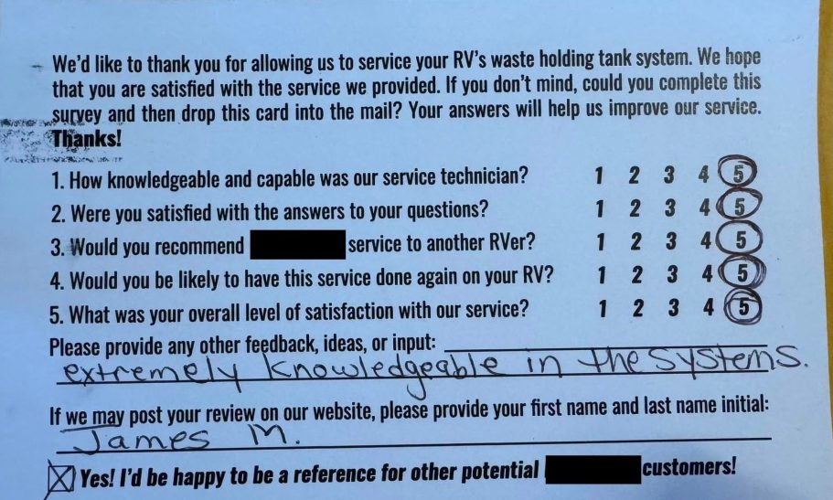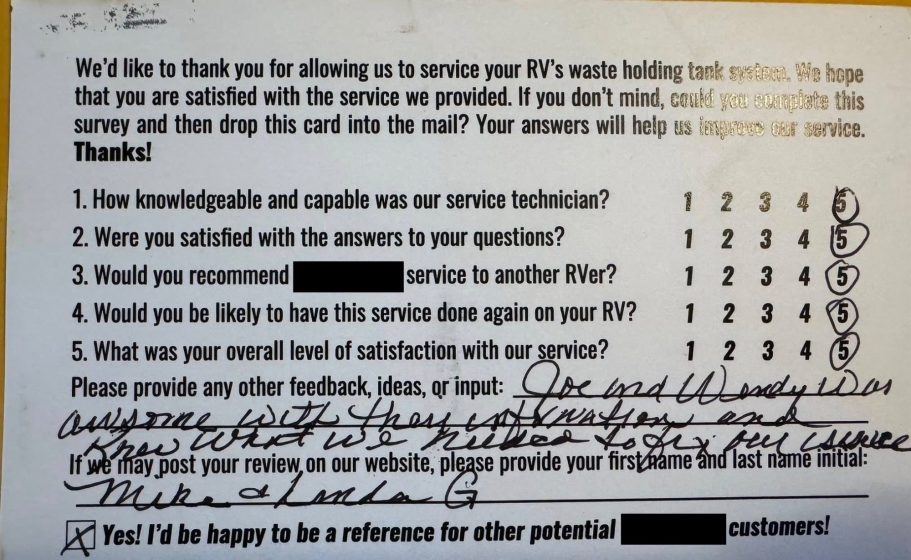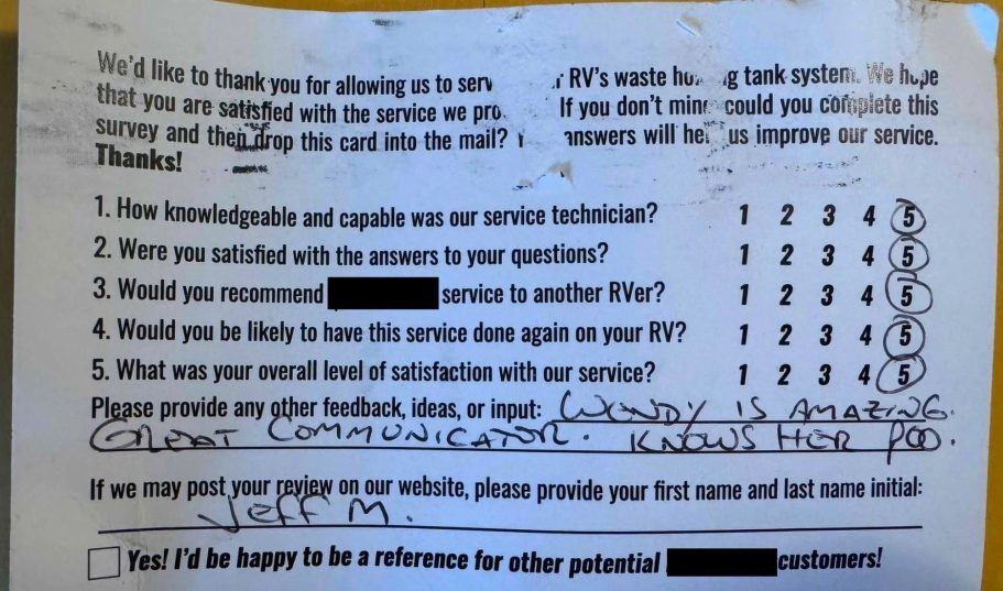 Wendy was terrific!! She was on time, efficient and effective and was a wealth of knowledge and experience. Would recommend her service to anyone looking to get their RV tanks cleaned.